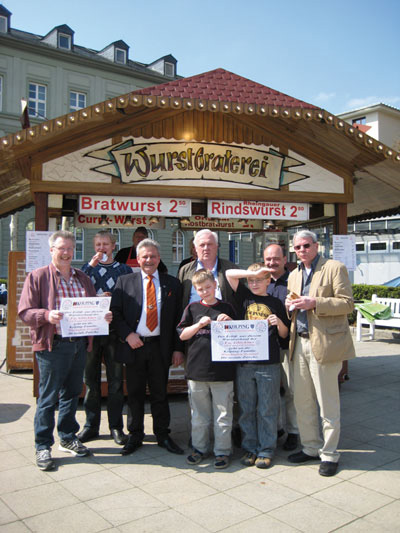 Eine Sonderaktion zugunsten der sozialen Projekte der Kolpingfamilie Wiesbaden-Zentral startete die Wurstbraterei Wolfgang Glöckner auf dem Luisenplatz gegenüber der St. Bonifatiuskirche. Bis zum 15. Mai verkauft das Team der Imbissbetriebe Wiesbadener Bratwurst, Rostbratwurst und Krakauer für den guten Zweck. Kolping-Chef Stefan Fink (3. v.l.) und Kolping-Koordinator Rainer Giehl (rechts) schauten persönlich mit einer Abordnung der Kolpingfamilie vorbei um sich bei Kolpingfreund Wolfgang Glöckner (Mitte) zu bedanken. „Einfach eine gute Idee bei jeder Wurst an Kolping zu denken.“ so kommentierte freudig der Vorsitzende Stefan Fink die Aktion.
